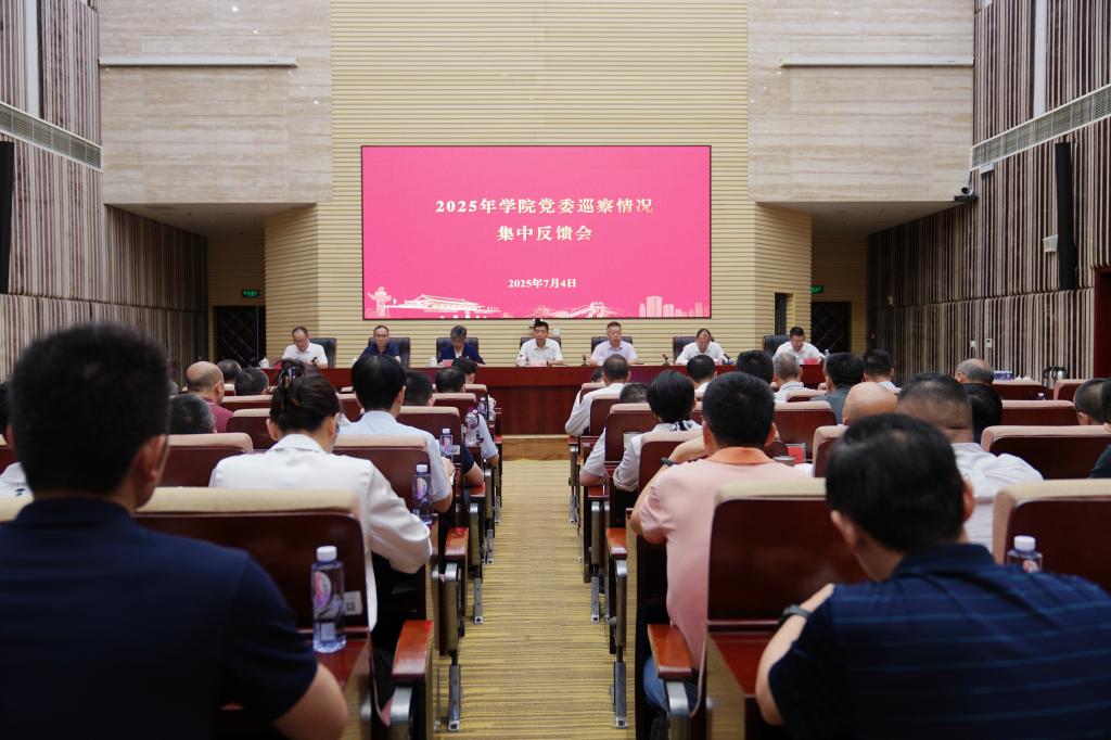 7月4日,学院2025年党委巡察情况集中反馈会在行政楼多功能会议室召开。会议传达学习习近平总书记在中央政治局会议审议《关于二十届中央第四轮巡视情况的综合报告》时的重要讲话精神、李希同志在二十届中央纪委四次全会所作的工作报告主要内容和二十届中央第四轮巡视集中反馈会议精神,通报学院党委本轮巡察发现的主要问题,表彰2025年度学院巡察工作先进个人,对巡察整改和成果运用作出部署。院长关立欣,党委副书记、组织部部长王维正,党委常委、纪委书记白珍,党委常委、副院长李卫东、马建新,党委常委、工会主席于金艳,总飞行师刘传健,巡察工作领导小组成员单位主要负责人,巡察组人员,被巡察党组织主要负责人,有关职能部门负责人参加会议。